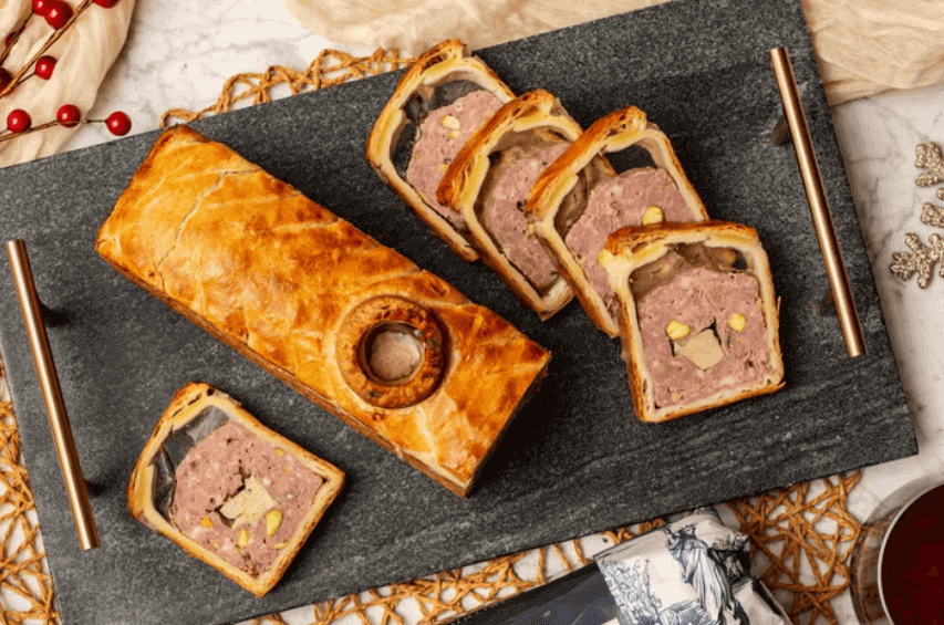 At first glance, it looks like a fancy loaf. In reality, it’s brilliantly practical: a seasoned meat pâté baked inside pastry, often with a visible mosaic of meat, herbs, pistachios, or a thin gelée layer that keeps it moist.